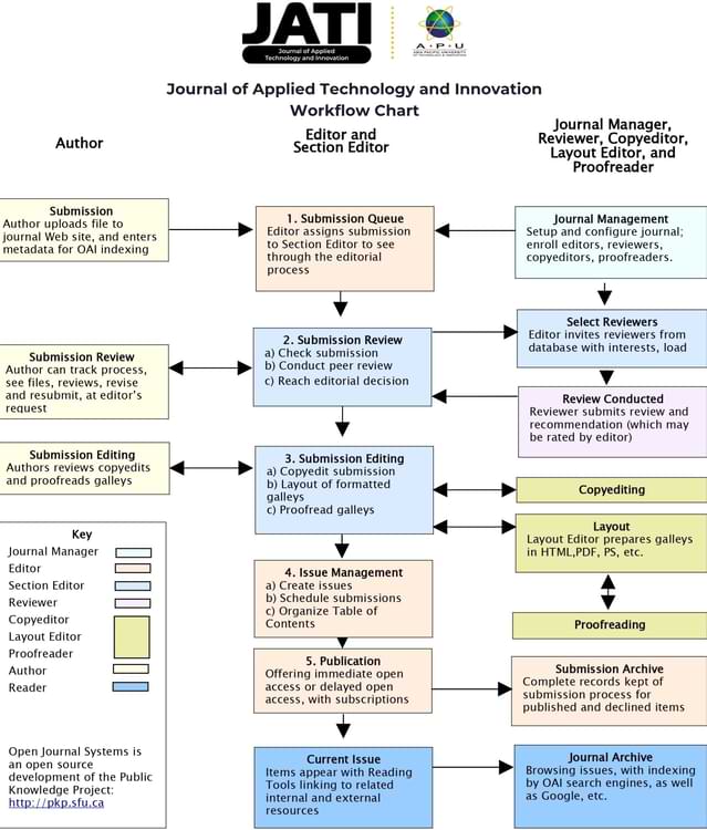 The JATI peer-review process is single-blinded; reviewers know the authors of the manuscript, but authors do not know the reviewers’ identities. Every manuscript submitted to JATI undergoes the following editorial workflow during the review process.